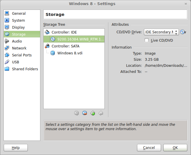 Langkah selanjutnya adalah memasukkan file ISO Windows 8 anda ke DVD drive virtual, caranya anda klik kanan pada OS Windows 8 nya lalu pilih menu Settings, lalu masuk ke menu Storage > Controller: IDE, kemudian klik pada tulisan Empty di bawahnya, kemudian klik icon bergambar CD pada bagian sebelah kanan lalu pilih menu Choose a virtual CD/DVD disk file, silahkan masukkan file ISO Windows 8 anda disitu lalu klik tombol OK.